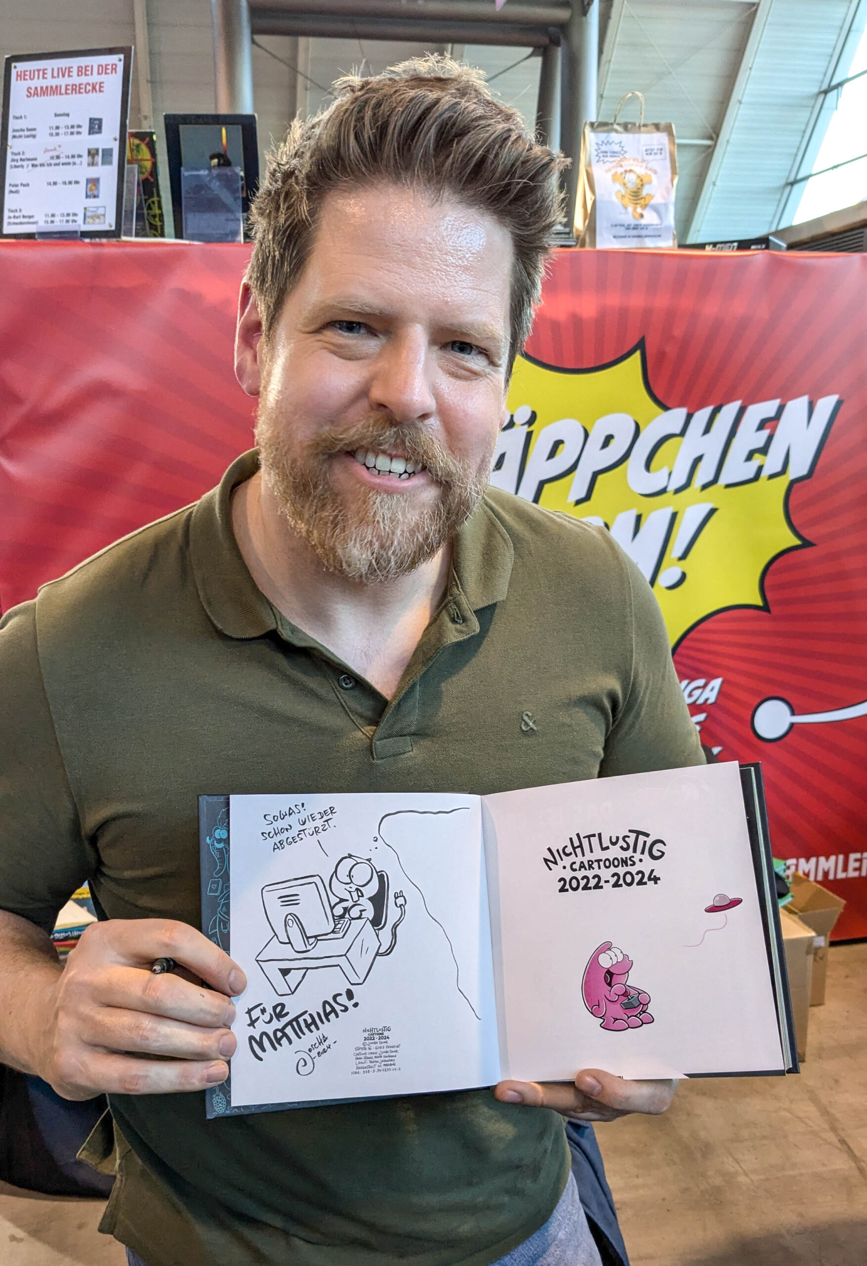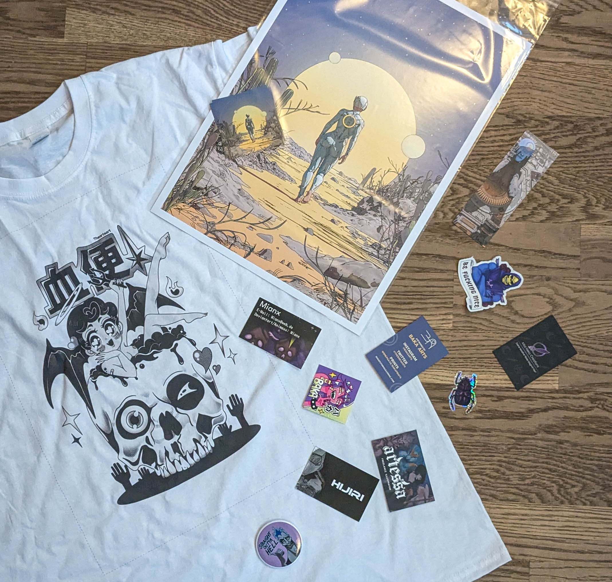 Natürlich ist so eine Convention auch immer eine ganz tolle Möglichkeit sich mit anderen Künstler:innen zu vernetzen und das ist uns glaube ich ganz gut gelungen. Eine schöne Sache ist, wenn man mit Nachbarständen direkt was tauschen kann. Es wurden außerdem auch wie immer fleißig Visitenkarten gesammelt.