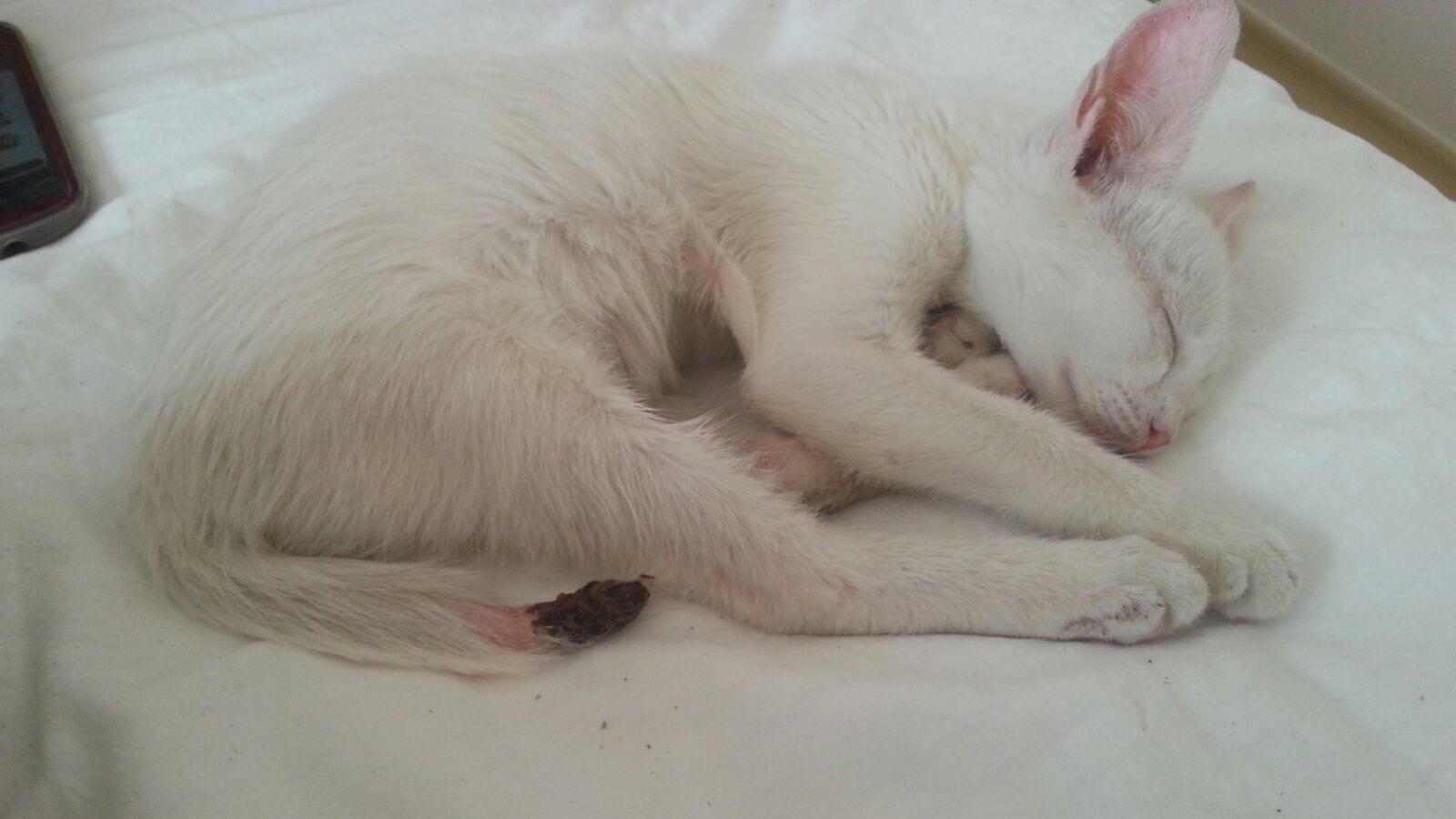Pocky war ein halb verhungerter kleiner Streuner am Strand. Sein Schwanz war wahrscheinlich von Ratten angefressen worden.